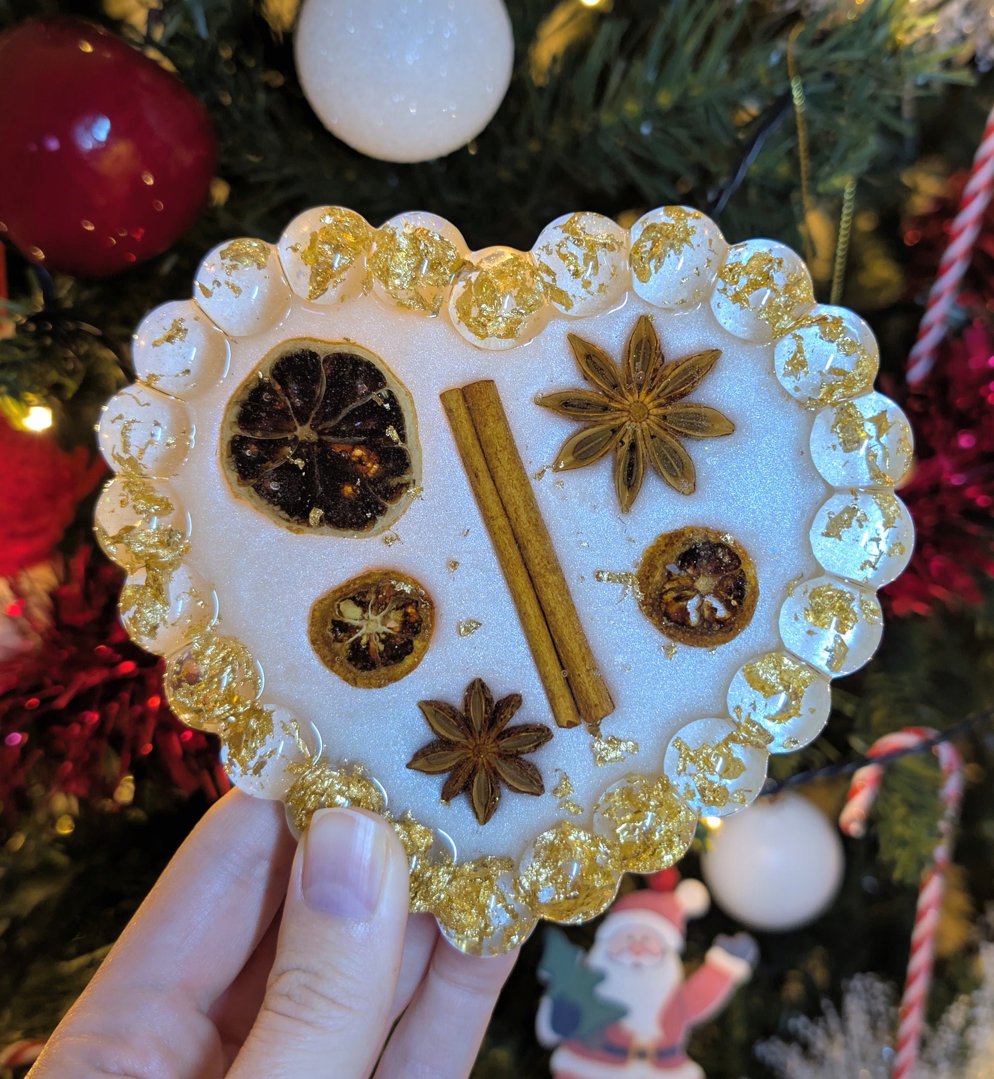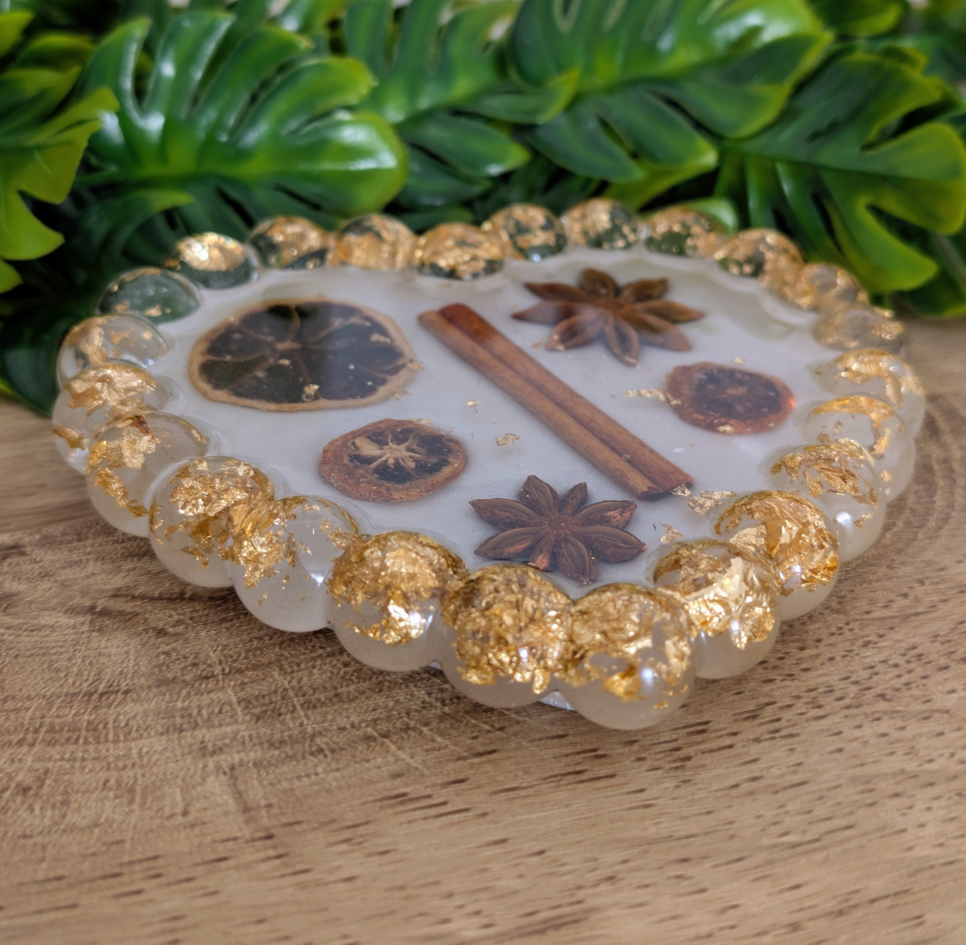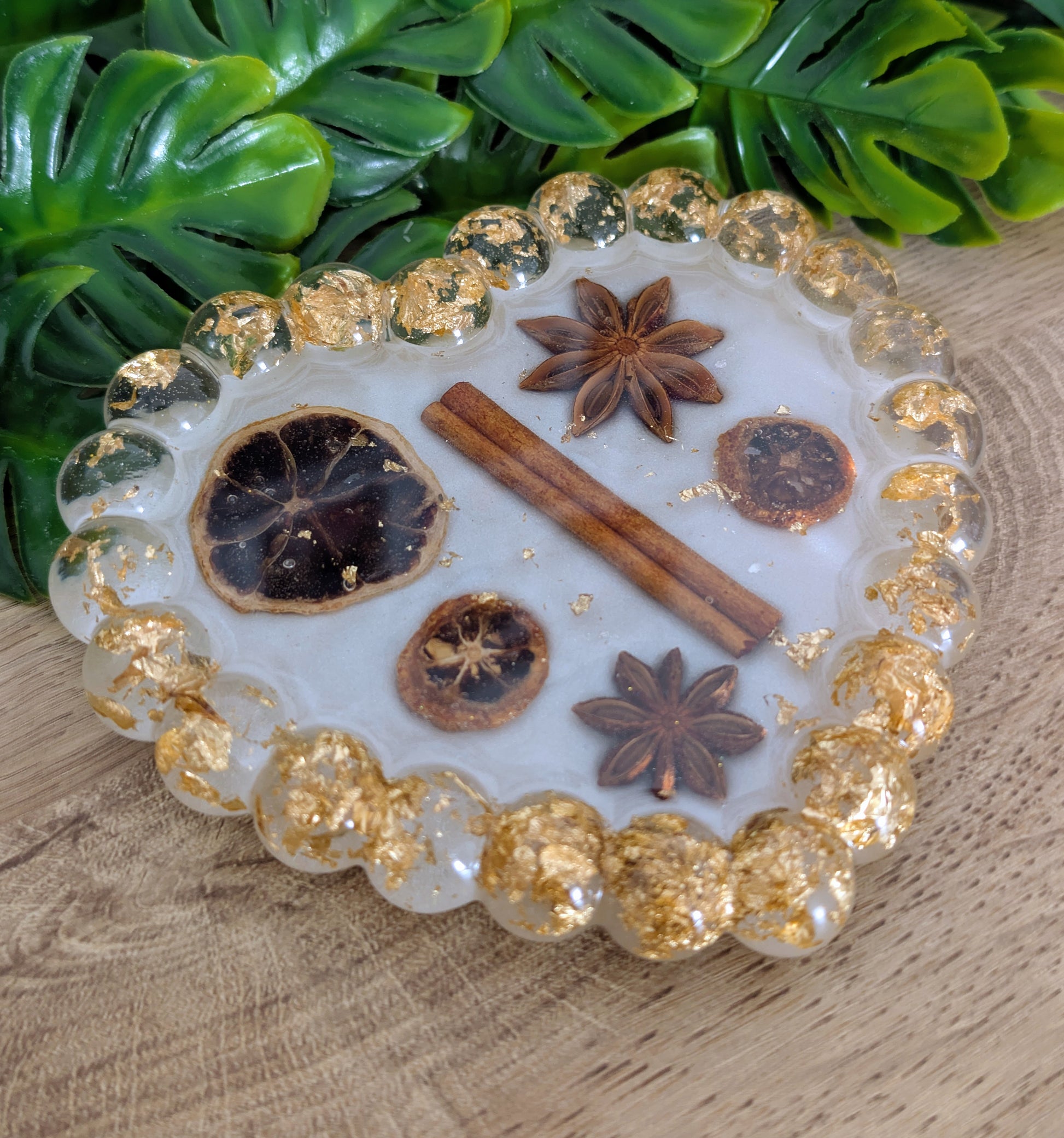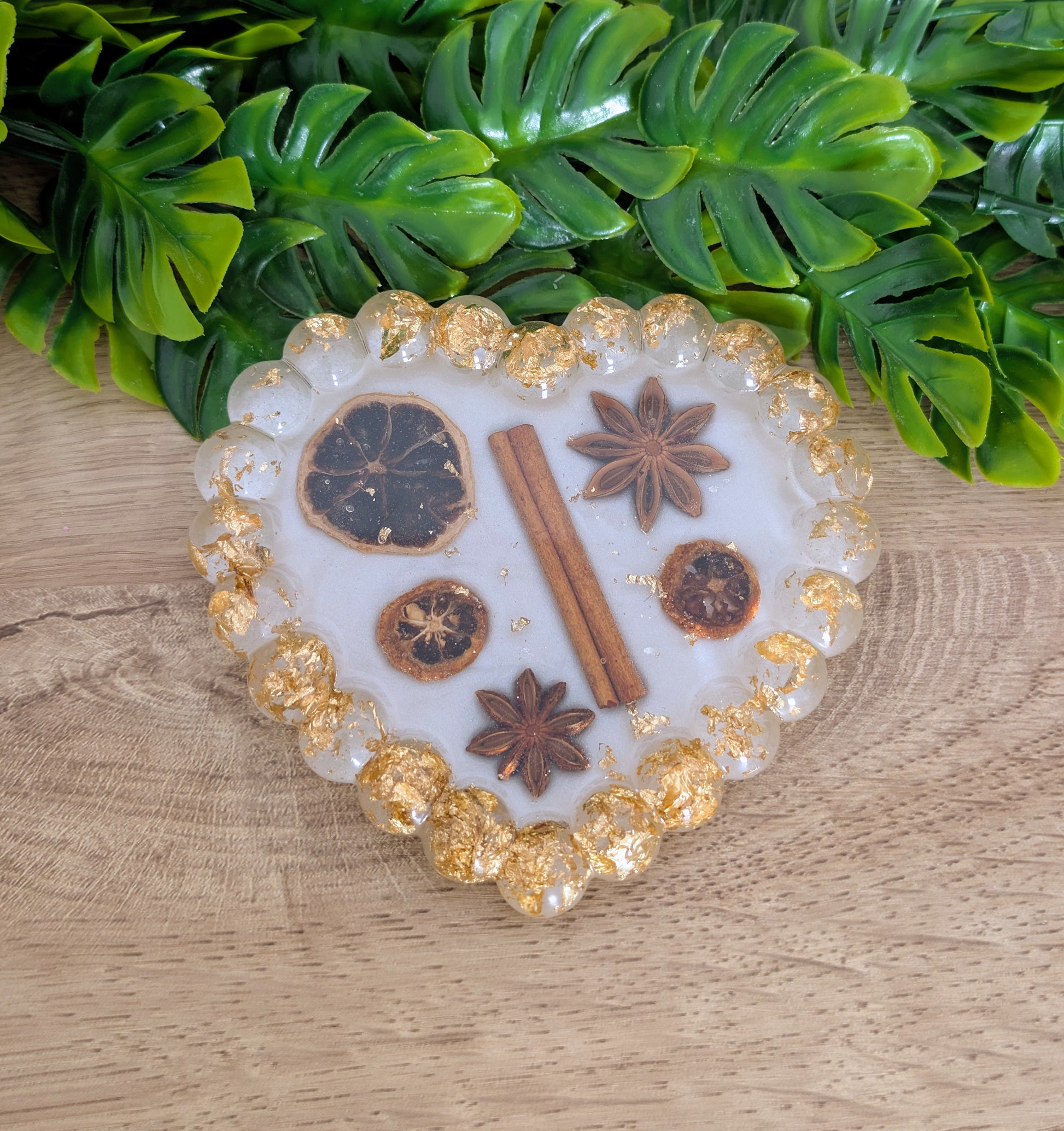 Son design réunit des éléments naturels comme la cannelle, la badiane et des tranches d’orange séchées, directement incrustés dans la résine.